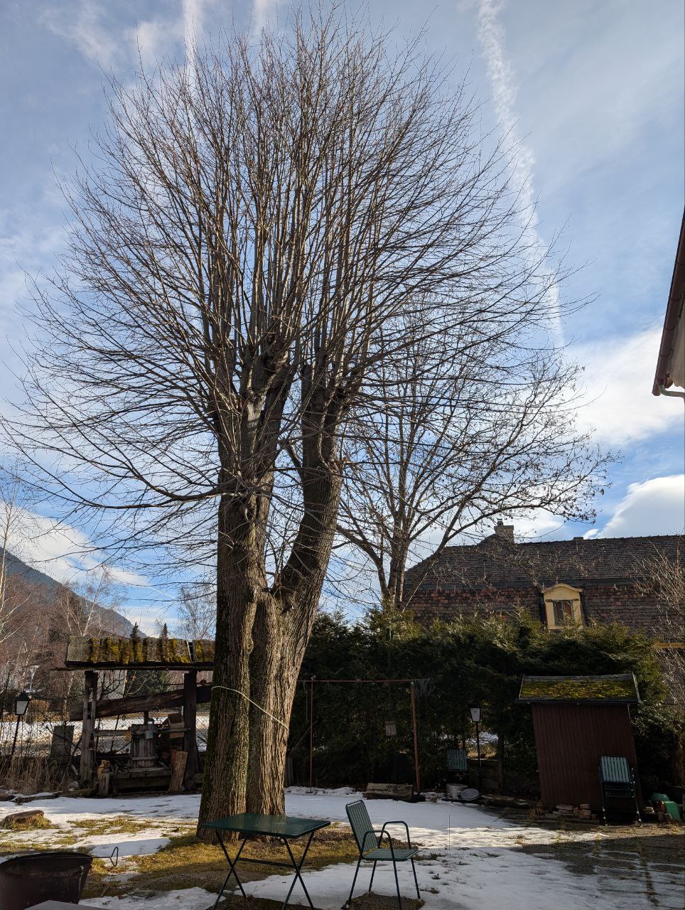 Attaching a pole horizontally to the crown of the Linden tree, so that swings and ropes can be attached.