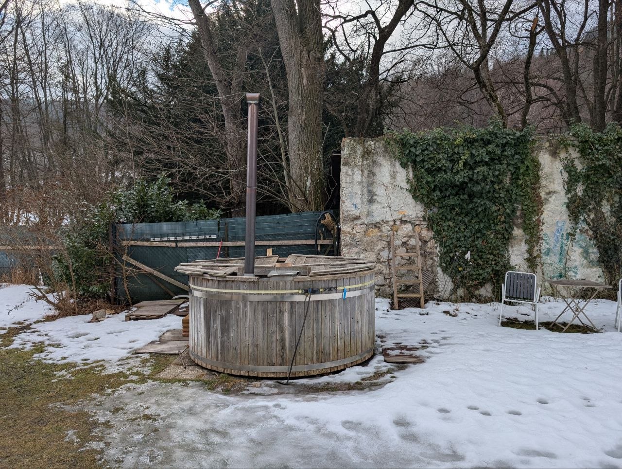 The good old tub has unfortunately cooked its last commoner last year ☹ ! But don't you weep, we'll buy a new tub, to be set up during the Hack! Then, while it is filling and heating up, we plan on extending the stone platform to the right of the tub, and generally improve the area around the tub. With all this done we can inaugurate the new tub and enjoy directly the fruits of our labor with a well deserved dip.